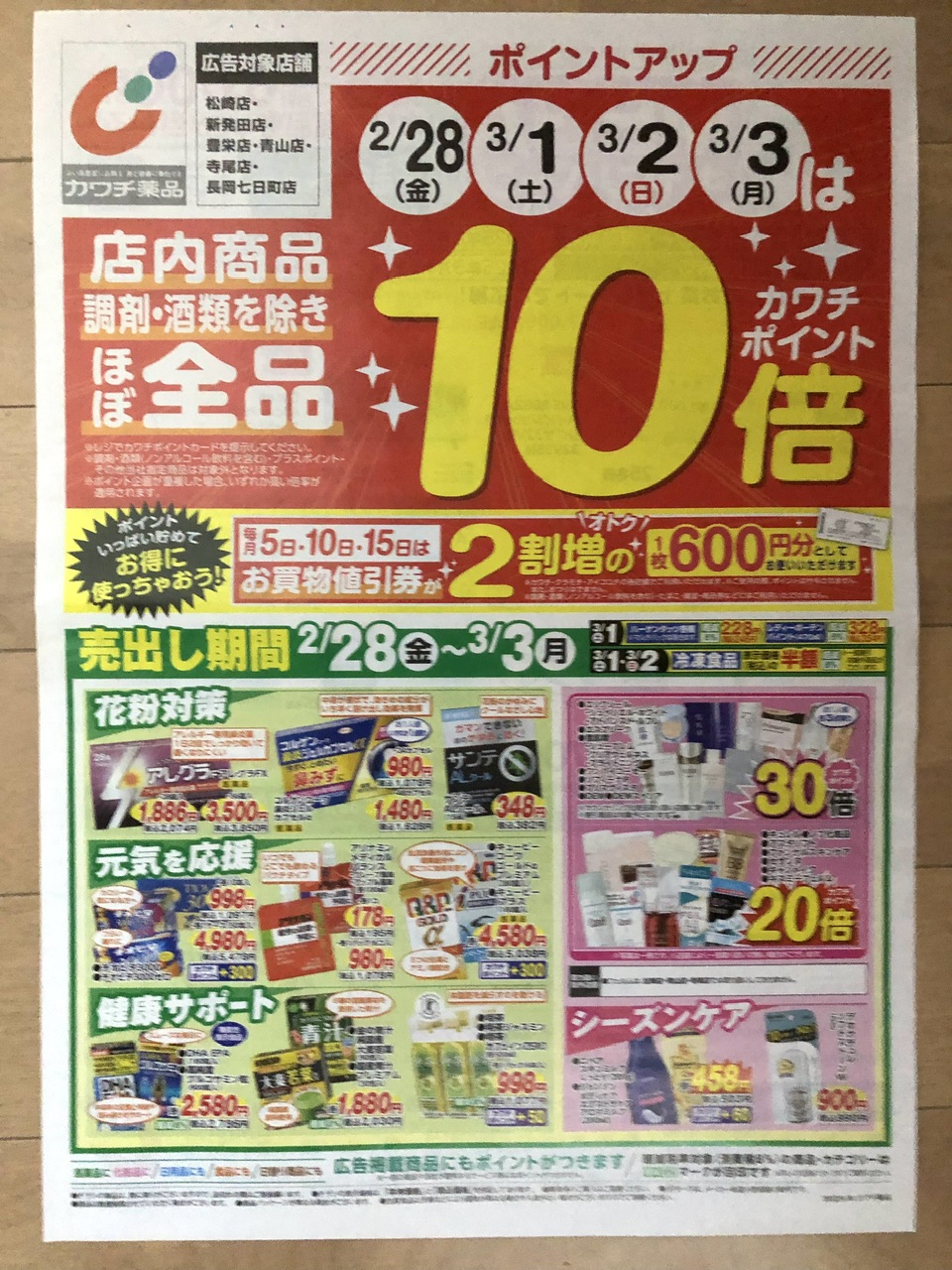 カワチポイント10倍 店舗名 : カワチ薬局チラシ期限 : 2025/3/3 店内ほぼ全品ポイント10倍! MEGAキャンペーン お買い上げレシートでご応募ください。 ダイソンコードレスクリーナーやカワチ商品券5万円等が当たります! 投稿ナビゲーション 前の記事春の大特売次の記事25周年ニコニコ感謝セール 2025年2月28日 zucky ジャンルなし, 新潟県 コメントを残す