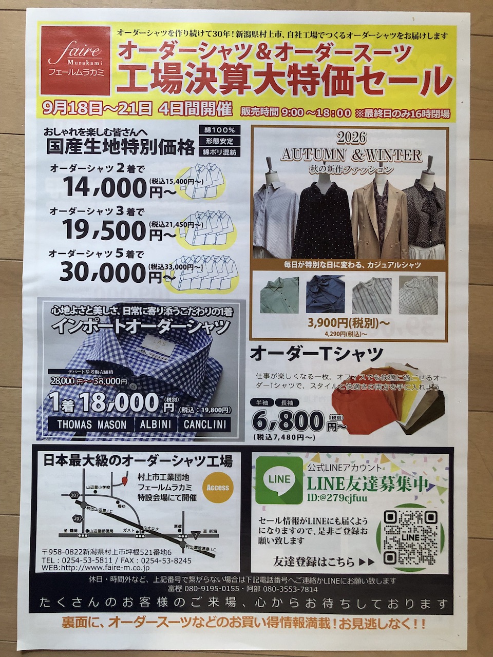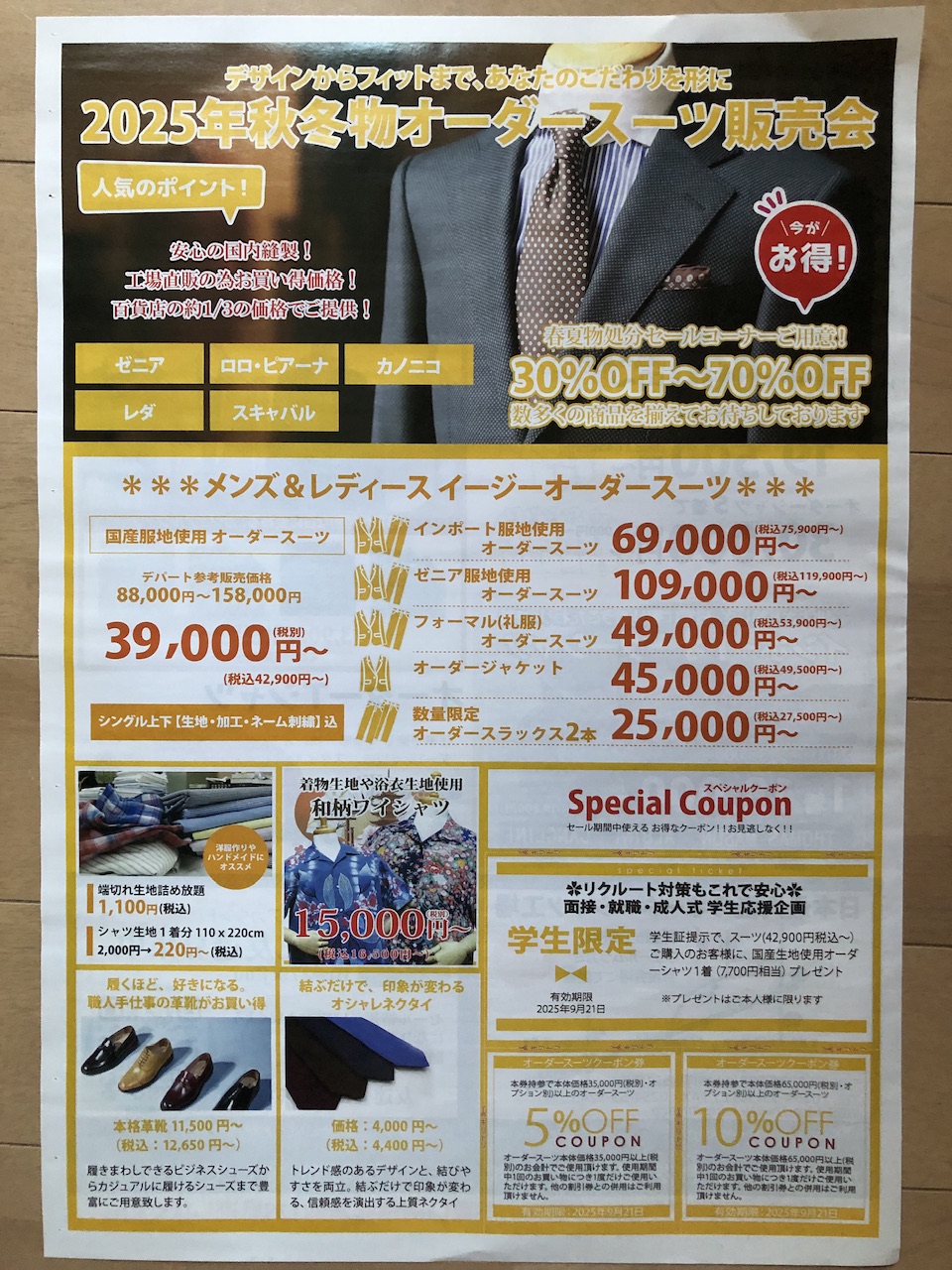 2025年秋冬物オーダースーツ販売会 店舗名 : フェールムラカミチラシ期限 : 2025/9/24 国産生地オーダーメードスーツ39,000円から インポート服地使用オーダーメードスーツ69,000円から 本格革靴11,500円から 国産生地オーダーシャツ2着14,000円から インポート服地オーダーシャツ18,000円から オーダーTシャツも扱っております。 投稿ナビゲーション 前の記事あがの牛強化月間次の記事秋のお彼岸 2025年9月13日 zucky ジャンルなし, 新潟県 コメントを残す