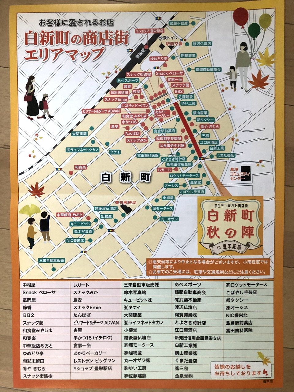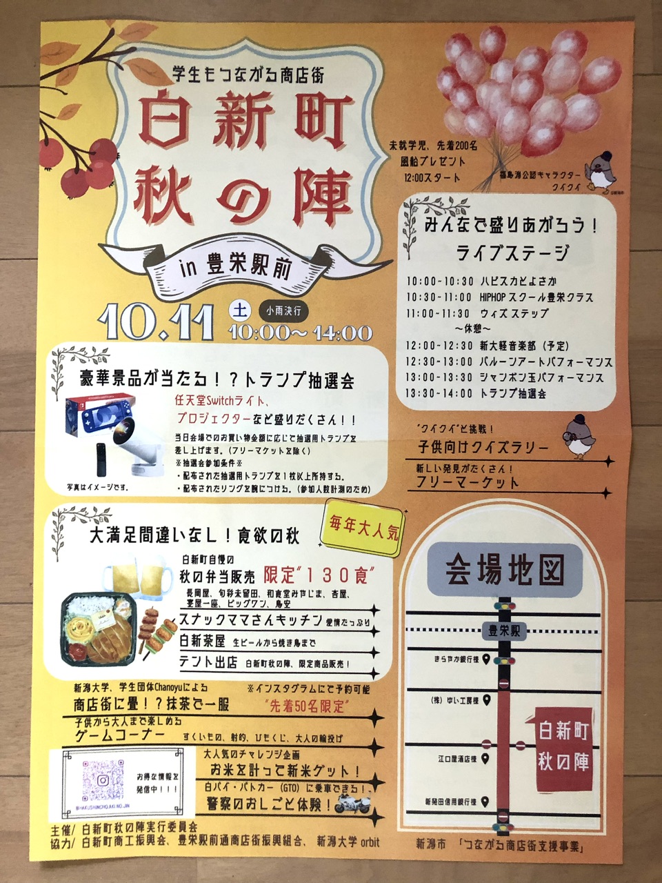 白新町秋の陣 店舗名 : 白新町商店街チラシ期限 : 2025/10/11 食欲の秋! 秋の弁当販売!限定130食! 商店街に畳?抹茶で一服(先着50名) 大人も子供も楽しめるゲームコーナー お米を測って新米ゲット! 白バイ、パトカーにも乗れる! ライブステージで盛り上がろう! 投稿ナビゲーション 前の記事半期決算売りつくし!次の記事梨マルシェ 2025年10月4日 zucky ジャンルなし, 新潟県 コメントを残す