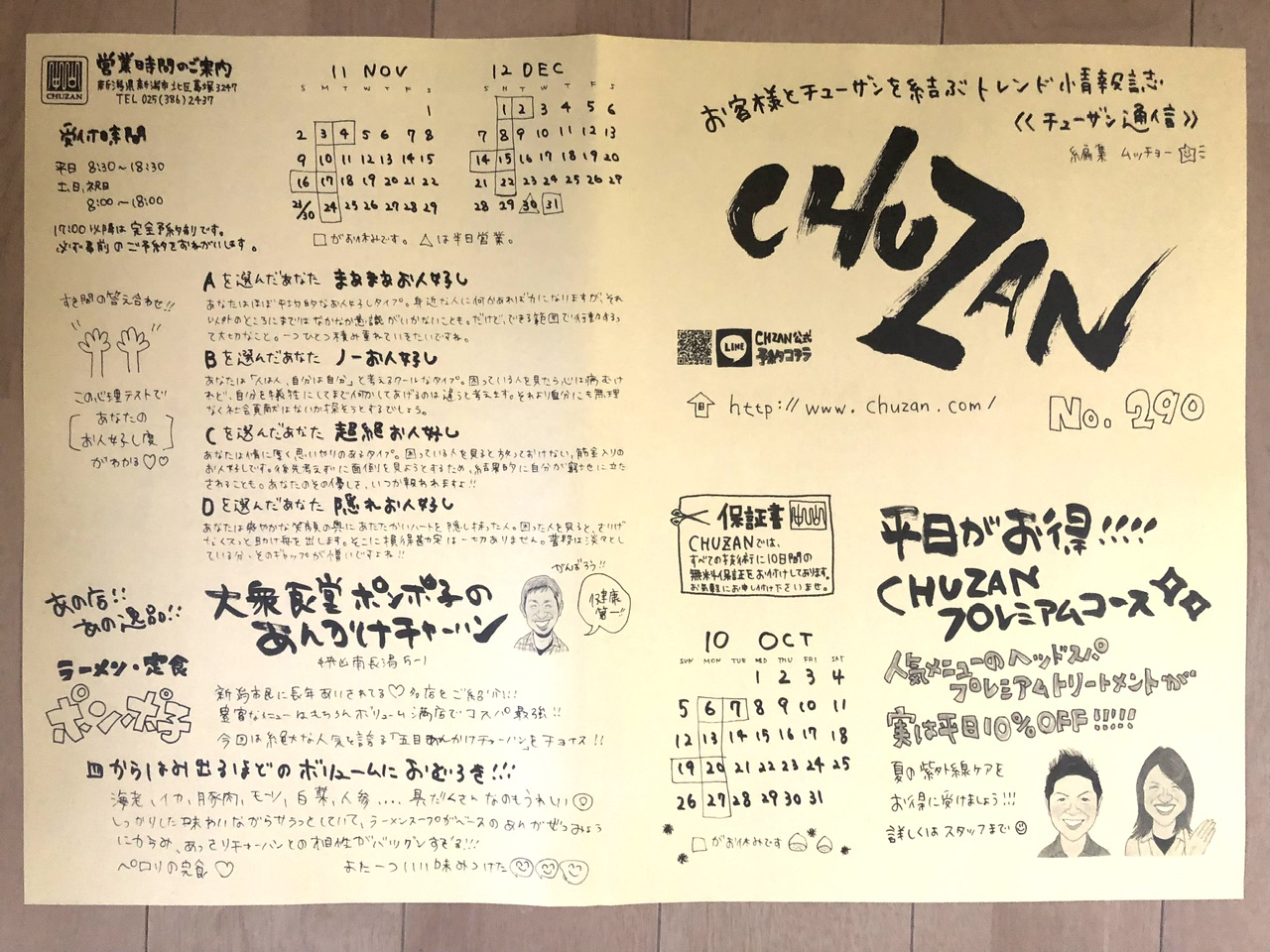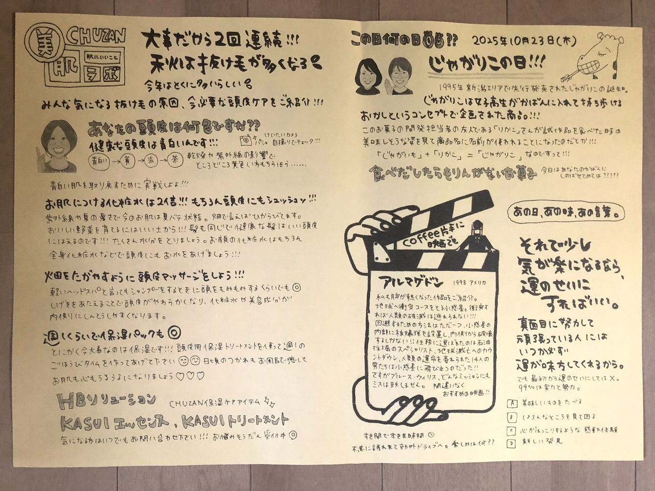 チューザン通信 店舗名 : CHUZANチラシ期限 : 2025/10/31 平日がお得!CHUZANプレミアムコース! あの店!この逸品!は、ラーメン定食ポンポ子 心理テストは、あなたのお人好し度。 この日何の日は、じゃがりこの日。 お勧め映画は、アルマゲドン。 投稿ナビゲーション 前の記事梨マルシェ次の記事誕生記念祭 2025年10月7日 zucky ジャンルなし, 新潟県 コメントを残す