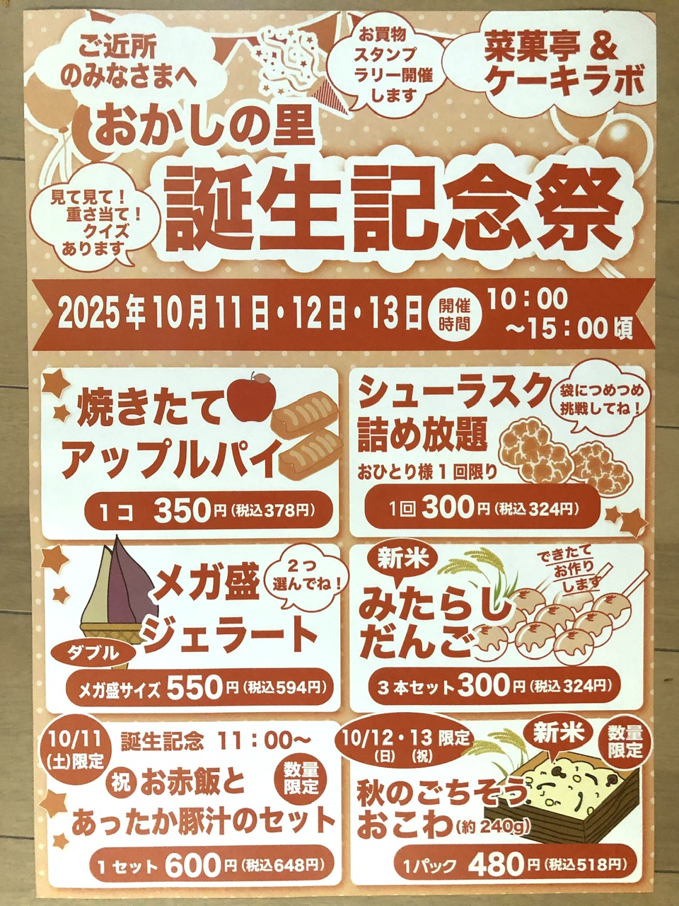 誕生記念祭 店舗名 : おかしの里チラシ期限 : 2025/10/13 焼きたてアップルパイ350円 シューラスク詰め放題300円 メガ盛りジェラート550円 みたらしだんご3本300円 お赤飯と豚汁セット600円 紅白大福作り300円 河川蒸気作りに挑戦200円 投稿ナビゲーション 前の記事チューザン通信次の記事生誕祭 2025年10月9日 zucky ジャンルなし, 新潟県 コメントを残す