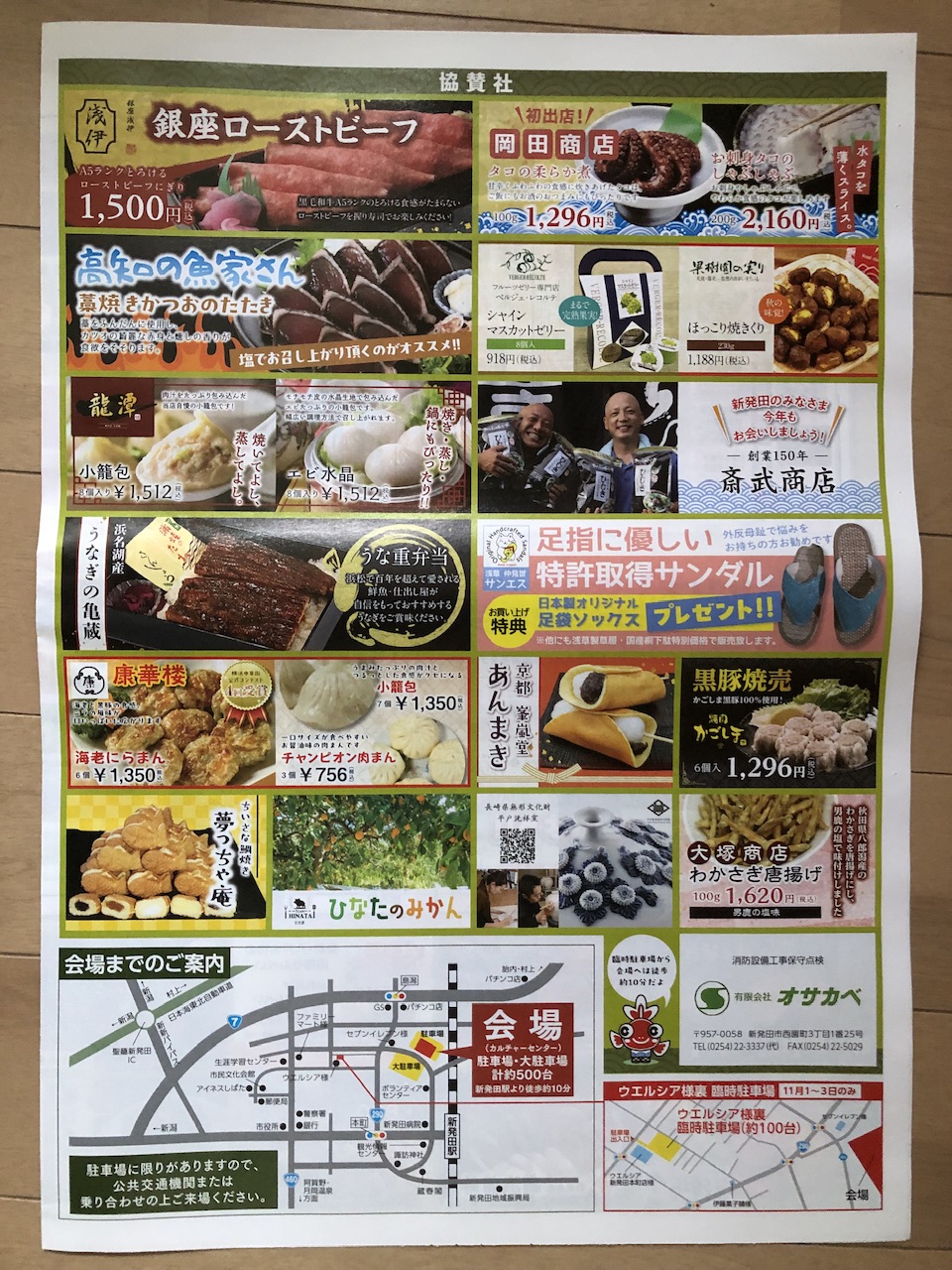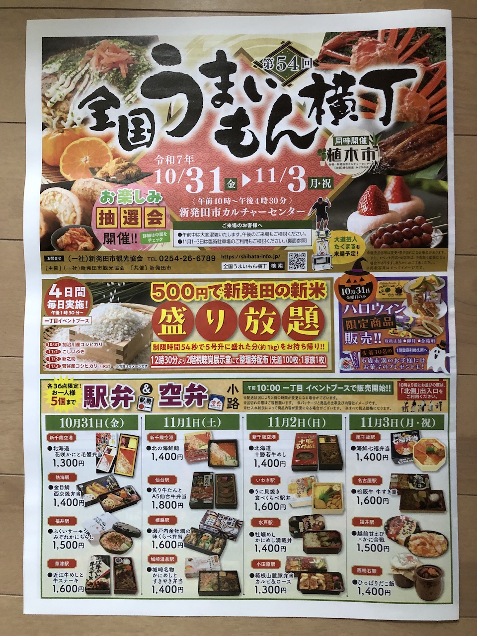 全国うまいもん横丁 店舗名 : 新発田市観光協会チラシ期限 : 2025/11/3 500円で新発田の新米盛り放題! 全国の駅弁、空弁、4日間で16種類販売! 初出店のお店も多数! 銀座ローストビーフ 浜名湖うなぎの亀蔵 京都あんまき 岡田商店のタコのやらわか煮他 お楽しみ抽選会はアンケートに答えてWチャンス! 投稿ナビゲーション 前の記事周年祭次の記事9月・10月〉ランチ&スイーツビュッフェ「Halloween Ghost Party」 2025年10月19日 zucky ジャンルなし, 新潟県 コメントを残す