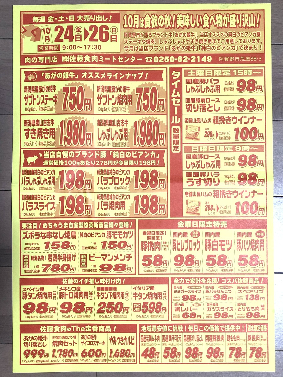 10月は食欲の秋! 店舗名 : 佐藤食肉ミートセンターチラシ期限 : 2025/10/26 新潟県産あがの姫牛 ざぶとんステーキ100g750円 すき焼き肉100g1,980円 タイムセール 国産豚ロースしゃぶしゃぶ用100g98円 粗挽きウインナー1パック100円 金曜日限定 国産豚ヒレブロック100g98円 お惣菜 串なし焼き鳥100g158円 若鶏半身揚げ780円 投稿ナビゲーション 前の記事9月・10月〉ランチ&スイーツビュッフェ「Halloween Ghost Party」次の記事秋のうまいものフェア 2025年10月24日 zucky ジャンルなし, 新潟県 コメントを残す