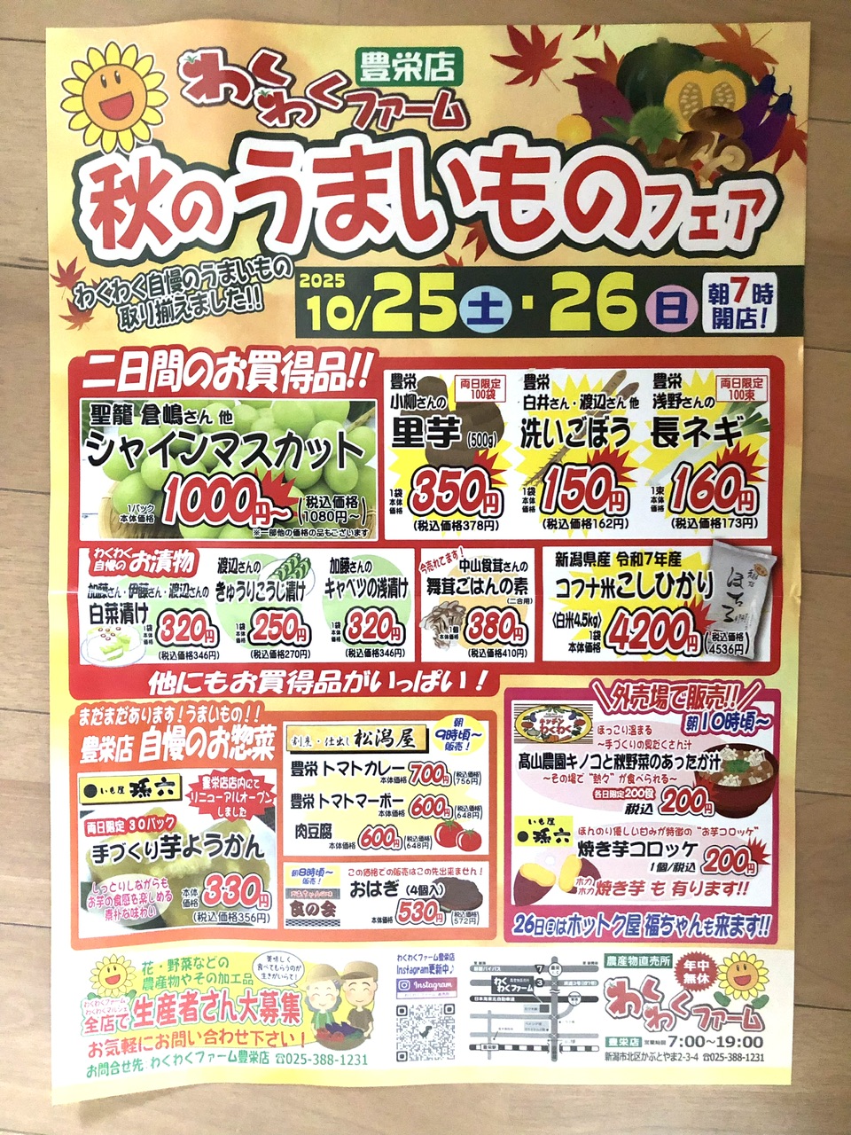 秋のうまいものフェア 店舗名 : わくわくファームチラシ期限 : 2025/10/26 新潟県産コシヒカリ4.5kg4200円 シャインマスカット1パック1,000円 手作り芋ようかん330円 焼き芋コロッケ200円 きのこと秋野菜のあったか汁200円 豊栄トマトカレー700円他 投稿ナビゲーション 前の記事10月は食欲の秋!次の記事新米特売 2025年10月25日 zucky ジャンルなし, 新潟県 コメントを残す
