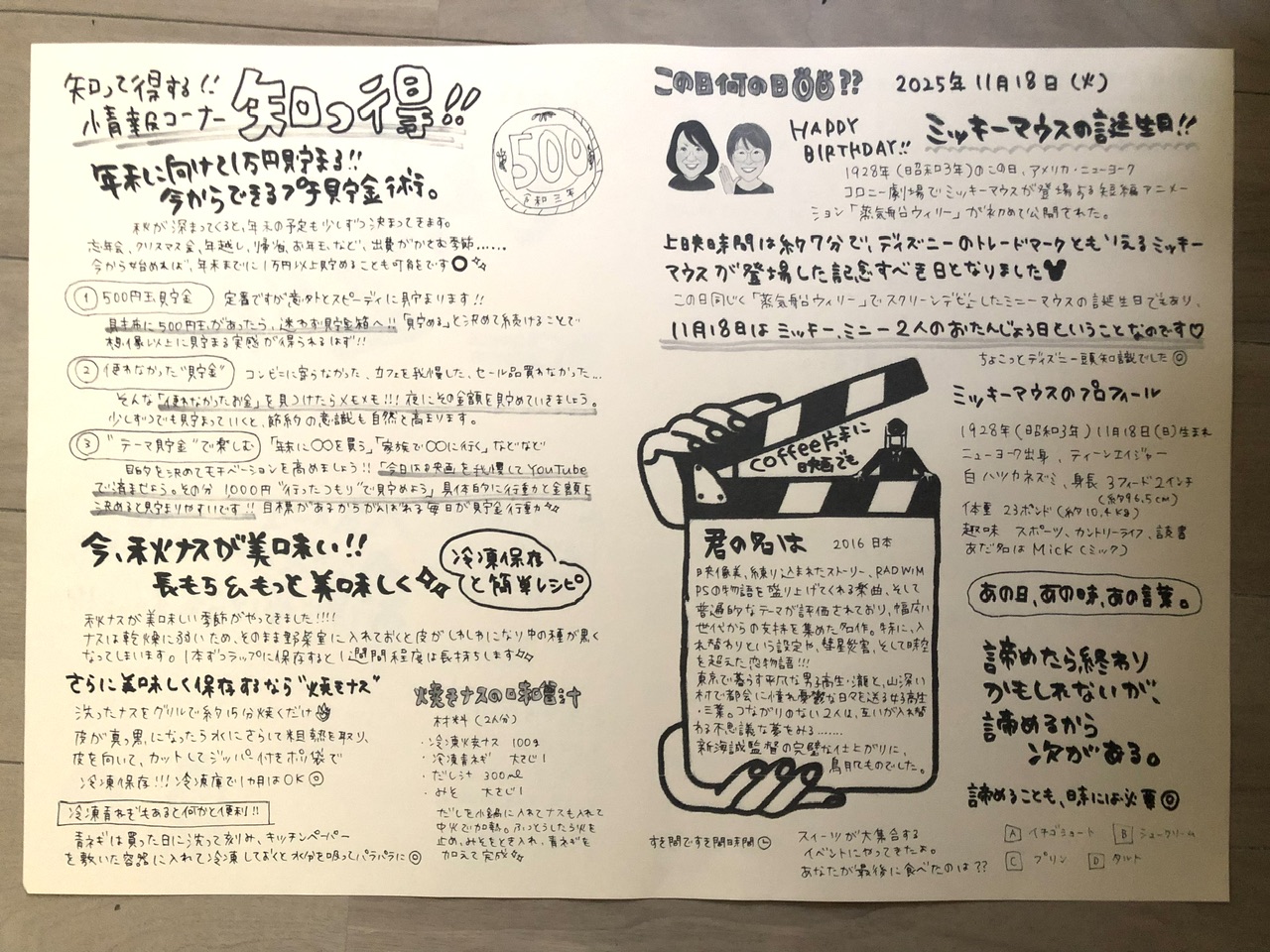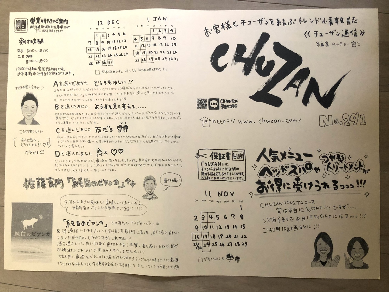 チャーザン通信 店舗名 : CHUZANチラシ期限 : 2025/11/30 人気メニューヘッドスパやつや髪トリートメントがお得に受けられる!! 心理テストは友人と恋人、どっちを取る?がわかる! この日何の日は、ミッキーマウスの誕生日! coffee片手に映画でも【君の名は】他 投稿ナビゲーション 前の記事7周年記念次の記事新潟おせち 2025年11月4日 zucky ジャンルなし, 新潟県 コメントを残す