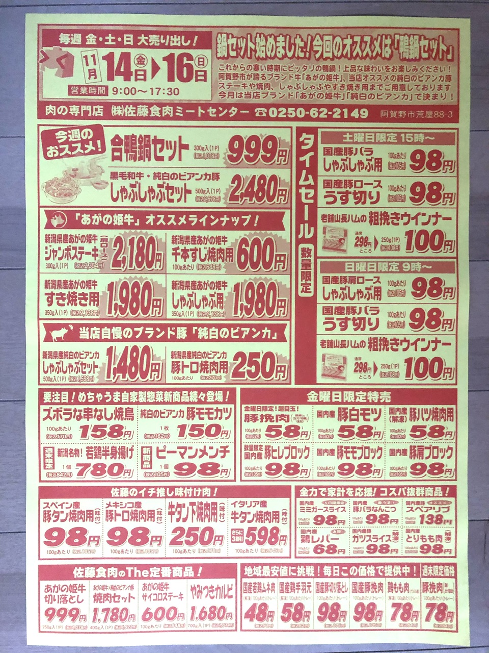 鍋セット始めました! 店舗名 : 佐藤食肉ミートセンターチラシ期限 : 2025/11/16 合鴨鍋セット999円 しゃぶしゃぶセット2,480円 イチ推し味付け肉 牛タン下焼肉100g250円 イタリア産牛タン味付598円 タイムセール 国産豚バラしゃぶしゃぶ用100g98円 国産ロースうす切り100g98円 粗挽きウインナー250g100円他 投稿ナビゲーション 前の記事2025シュークリーム謝恩セール次の記事120周年祭 2025年11月14日 zucky ジャンルなし, 新潟県 コメントを残す