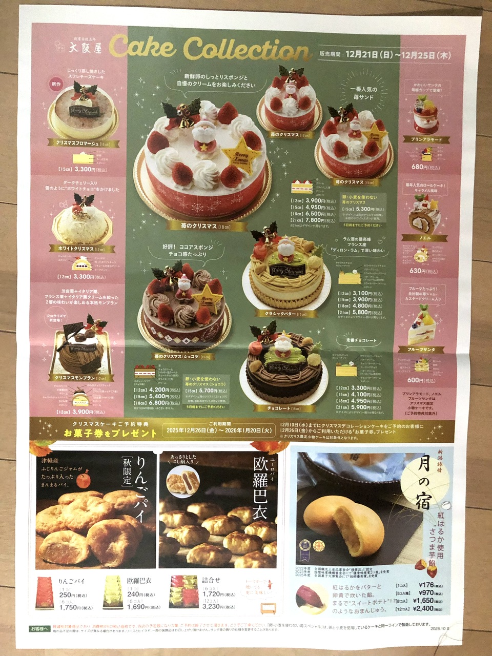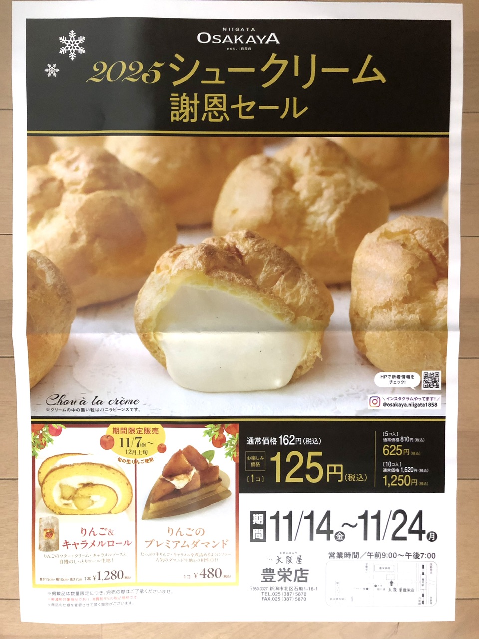 2025シュークリーム謝恩セール 店舗名 : 大阪屋チラシ期限 : 2025/11/24 今年も開催致します。 通常価格162円を125円! 期間限定品 りんご&キャラメルロール1,280円 りんごのプレミアムダマンド480円 クリスマスケーキご予約でお菓子券プレゼント! 投稿ナビゲーション 前の記事宙バス&ウォーターシャトルで「にいがた2km」を周遊!次の記事鍋セット始めました! 2025年11月14日 zucky ジャンルなし, 新潟県 コメントを残す