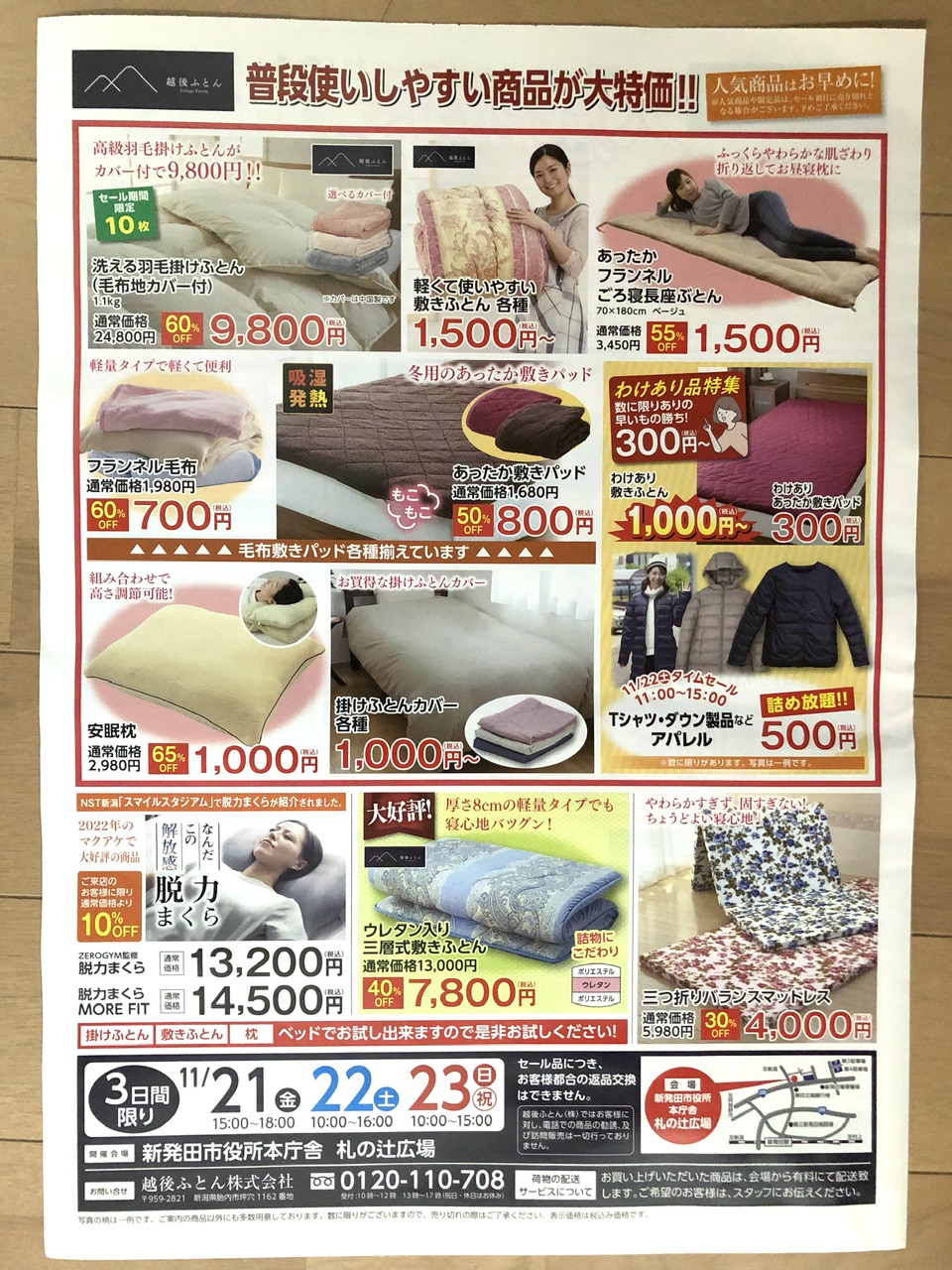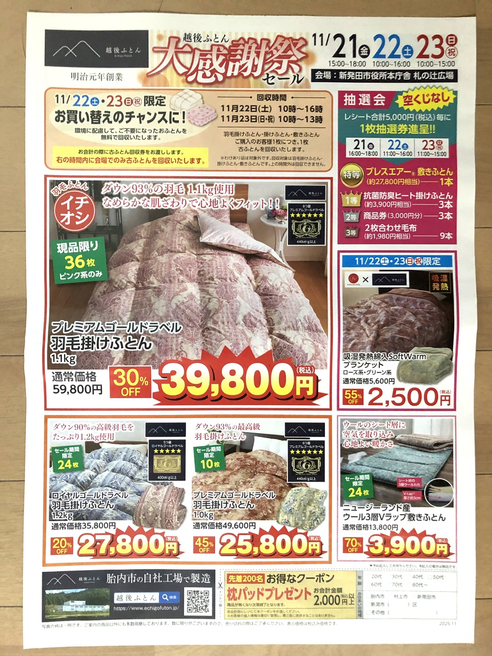 大感謝祭セール 店舗名 : 越後ふとんチラシ期限 : 2025/11/23 プレミアムゴールドラベル羽毛掛け布団25,800円から! ロイヤルゴールドラベル羽毛掛け布団27,800円! ニュージーランド産ウール3層敷布団3,800円! 訳あり品 Tシャツ、ダウン製品詰め放題500円 訳あり敷布団1,000円から 訳ありあったか敷きパッド300円 投稿ナビゲーション 前の記事冬の展示・講座・イベント企画次の記事スーパー尾山のビッグセール 2025年11月20日 zucky ジャンルなし, 新潟県 コメントを残す