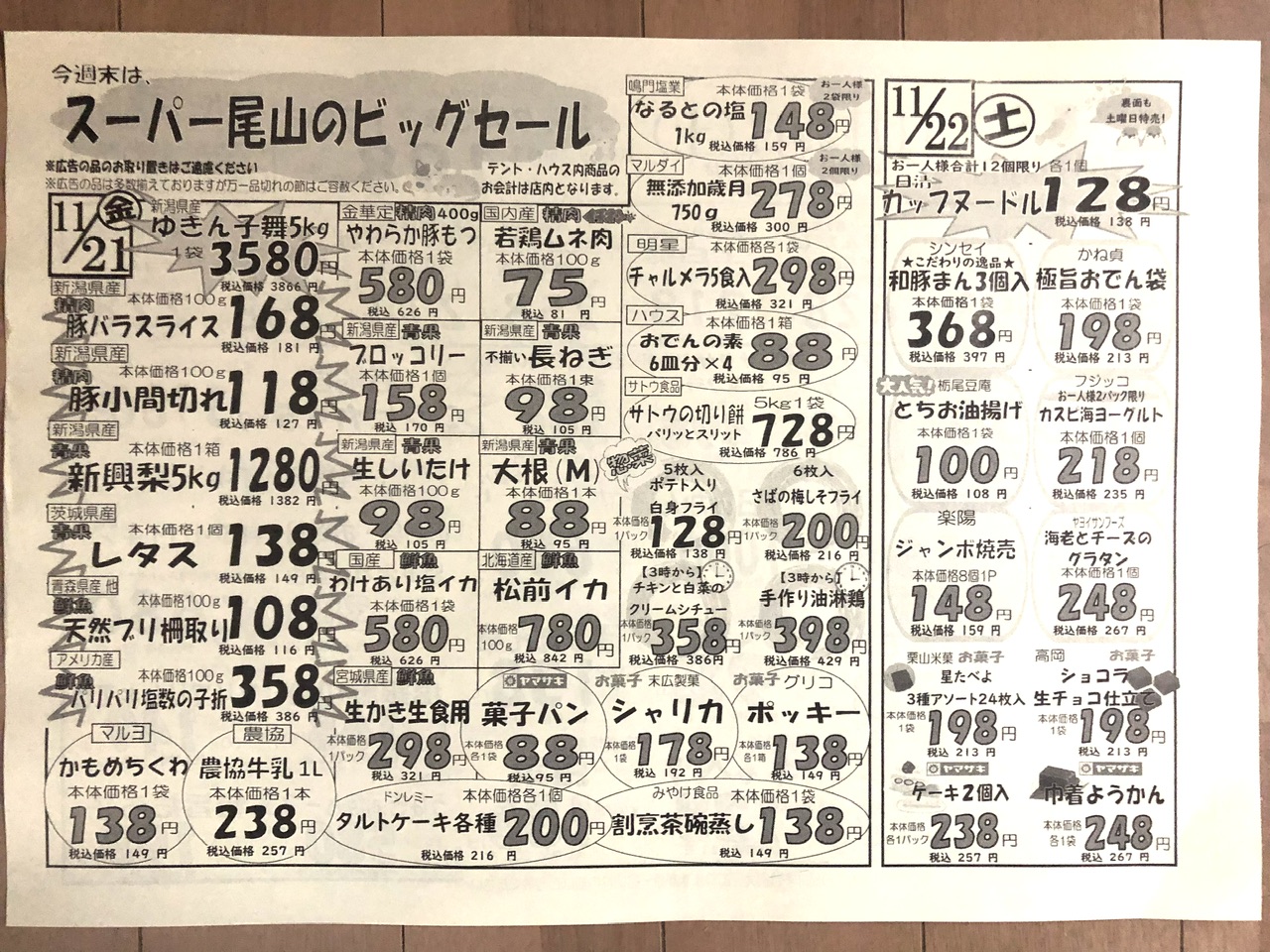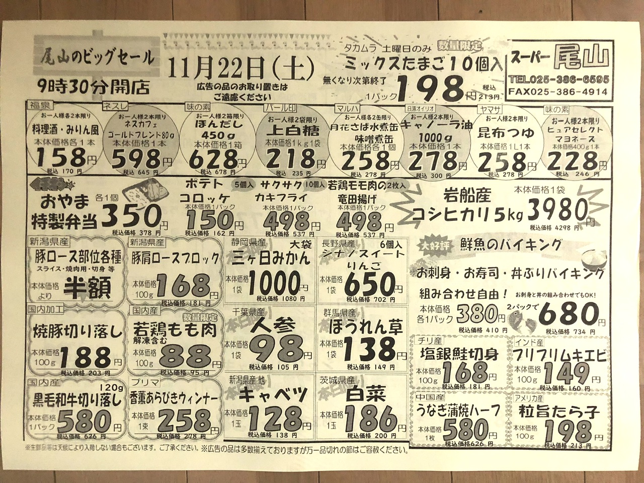 スーパー尾山のビッグセール 店舗名 : スーパー尾山チラシ期限 : 2025/11/22 ミックスたまご1パック198円 岩船産コシヒカリ5kg3,980円 カップヌードル128円 国産若鶏ムネ肉100g75円 新潟産豚ロース半額!他 投稿ナビゲーション 前の記事大感謝祭セール次の記事ハッピーホリデーピザ2025 2025年11月21日 zucky スーパー, 新潟県 コメントを残す