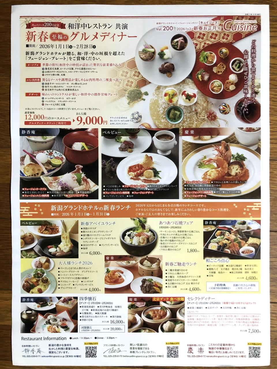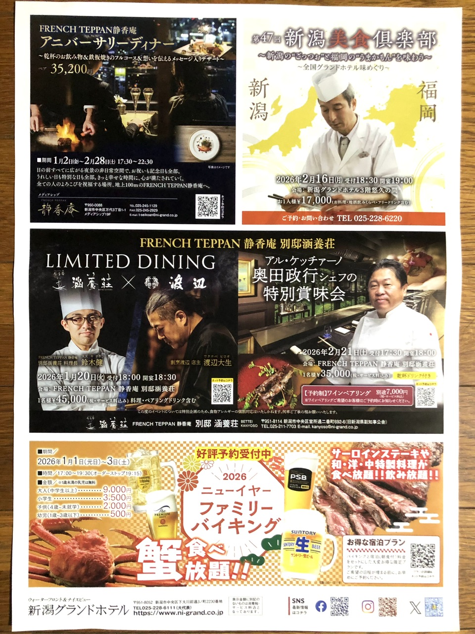 新春グルメディナー 店舗名 : 新潟グランドホテルチラシ期限 : 2026/2/28 新潟グランドホテルが贈る、和、洋、中の垣根を超えたフュージョンプレートをご賞味下さい。 元日から新春ランチ1,800円から。 フレンチ鉄板、静香庵のアニバーサリーディナー2名35,200円 ニューイヤーファミリーバイキングは蟹、ステーキが食べ放題! 投稿ナビゲーション 前の記事初詣 二年参り 2025年12月14日 zucky ホテル, 新潟県 コメントを残す
