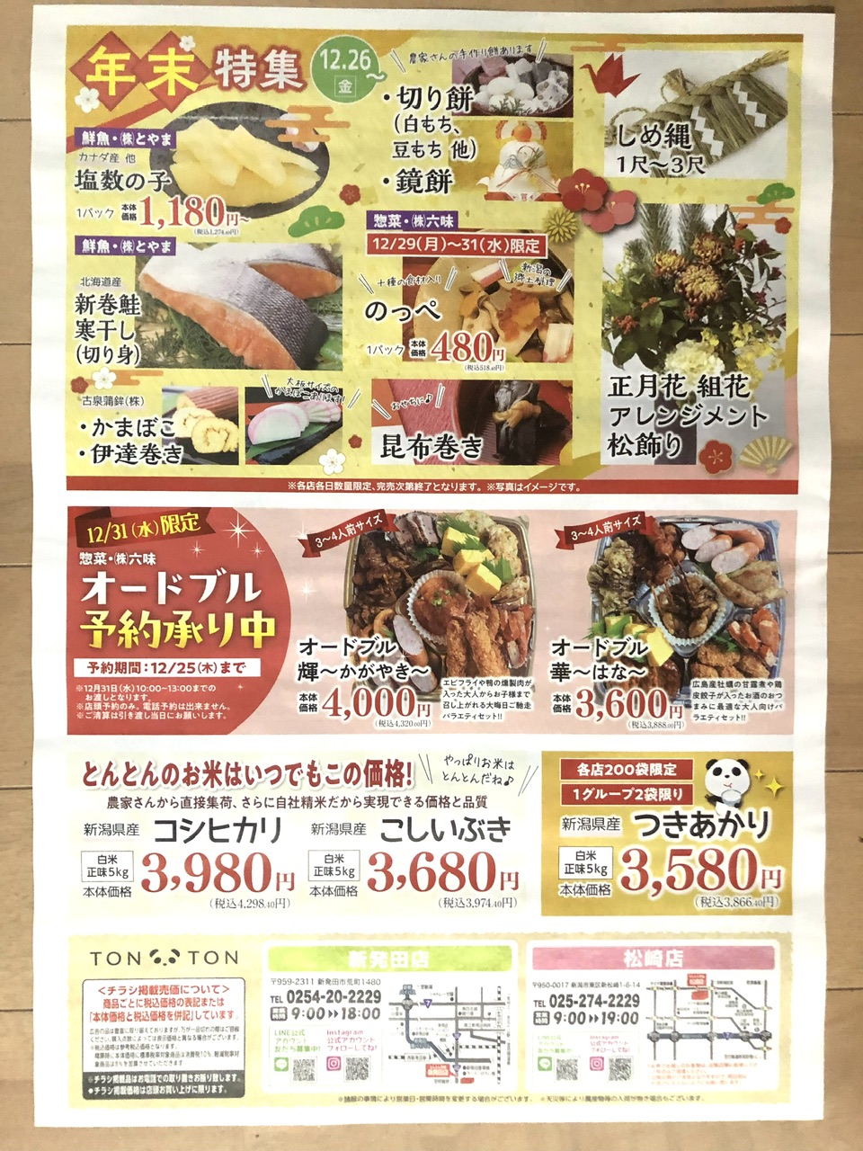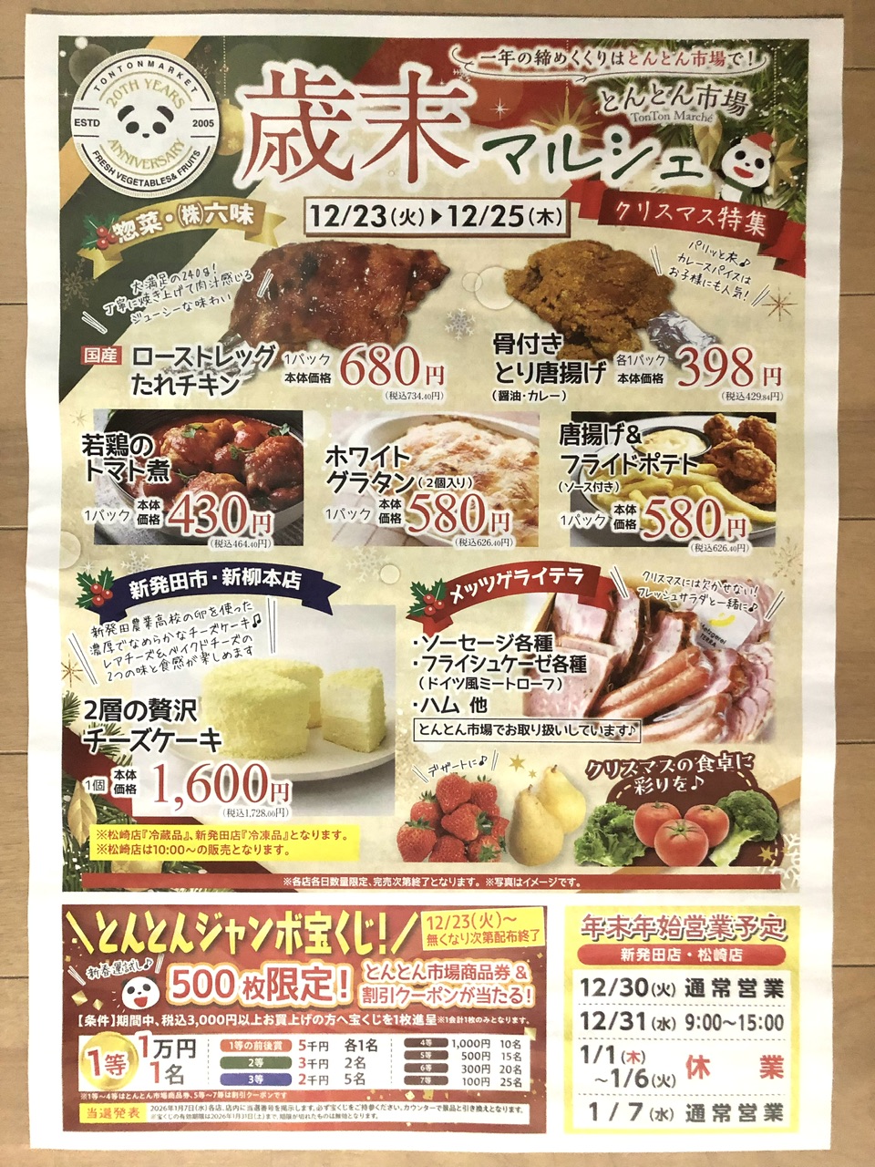 歳末マルシェ 店舗名 : とんとん市場チラシ期限 : 2025/12/25 ローストレッグチキン680円 骨付きとり唐揚げ398円 若鶏トマト煮430円 二層の贅沢チーズケーキ1,600円 年末特集 塩数の子1,180円 のっぺ480円 オードブル3,600円から 投稿ナビゲーション 前の記事よしやのチキンでクリスマス次の記事歳末大感謝祭 2025年12月23日 zucky ジャンルなし, 新潟県 コメントを残す