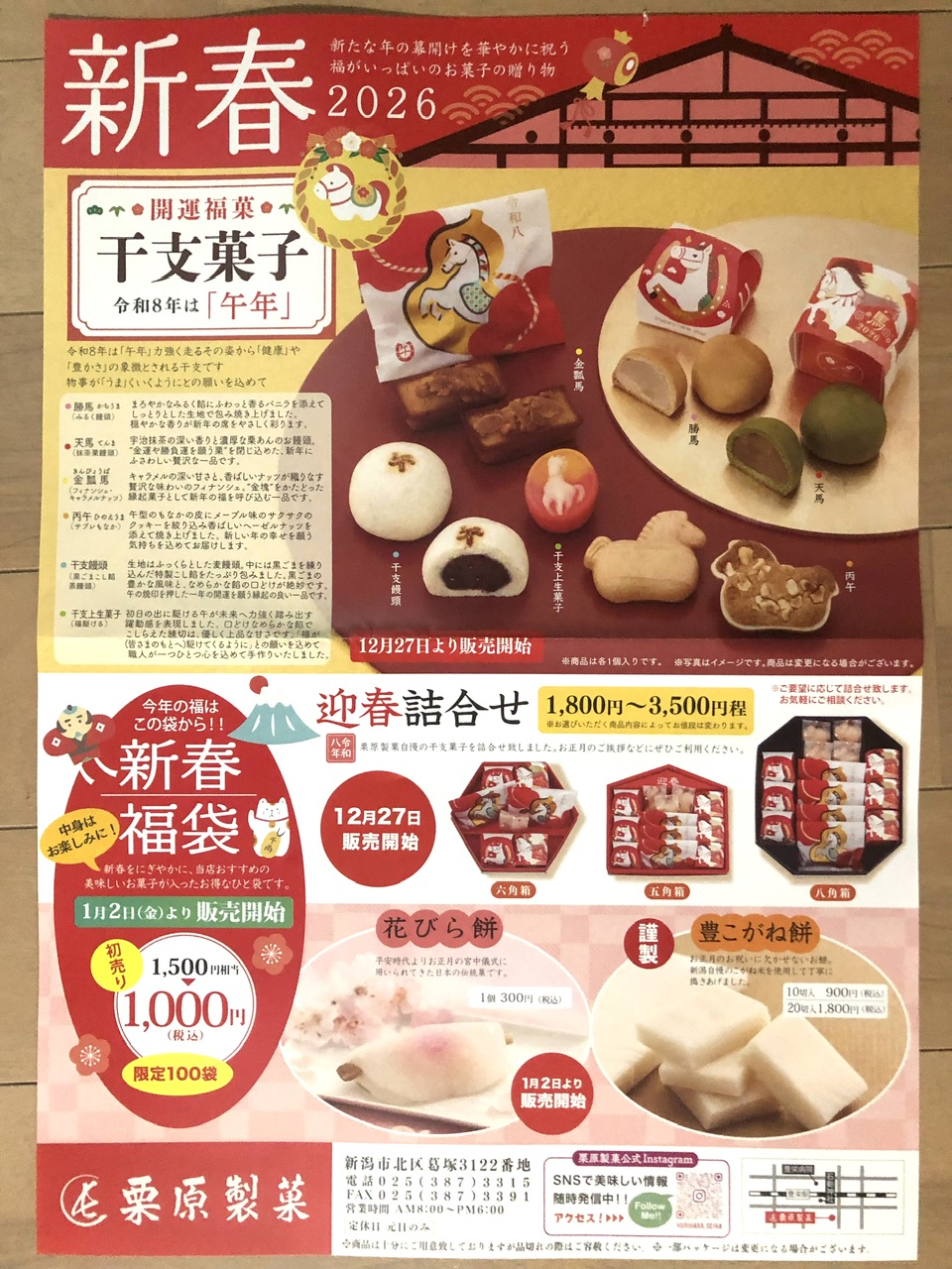 開運福菓 干支菓子 店舗名 : 栗原製菓チラシ期限 : 2026/1/2 勝馬(みるく饅頭) 天馬(抹茶栗饅頭)他、干支菓子 迎春詰め合わせ1,800円から 新春福袋1,000円! 投稿ナビゲーション 前の記事今年一年の感謝をこめて 年末大売り出し次の記事年末のお買い得品 2025年12月27日 zucky ジャンルなし, 新潟県 コメントを残す