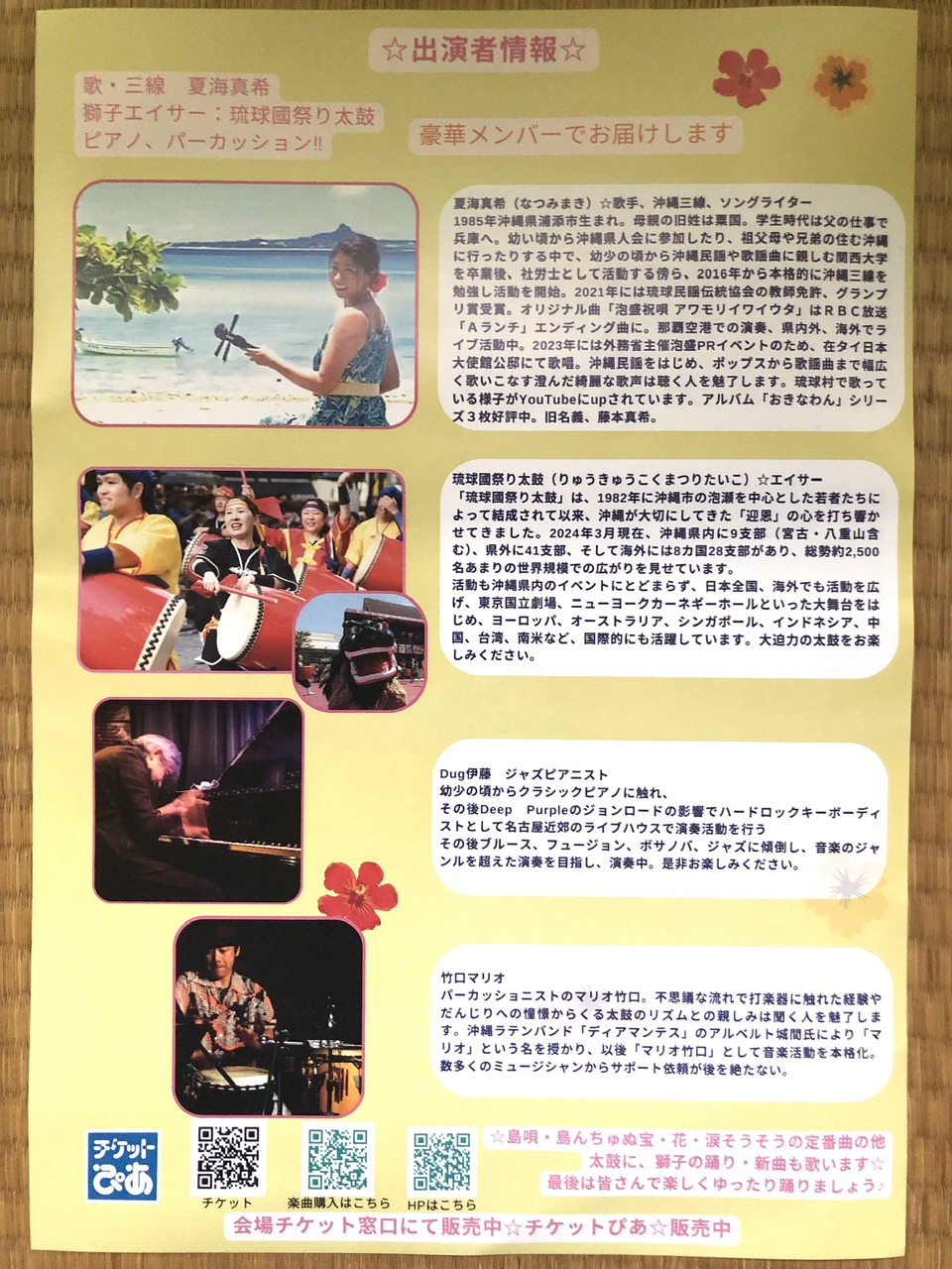 沖縄音楽コンサート 店舗名 : 北区文化会館チラシ期限 : 2026/3/4 沖縄三線&澄んだ歌声で聴く 沖縄音楽コンサート 夏海 真希 エイサー太鼓 琉球國祭り太鼓 ピアノ&パーカッション 投稿ナビゲーション 前の記事白山神社へ初詣次の記事新春初売り 2025年12月31日 zucky ジャンルなし, 新潟県 コメントを残す