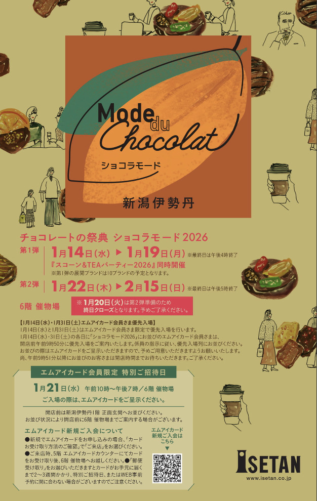 ショコラモード2026 店舗名 : 新潟伊勢丹チラシ期限 : 2026/2/15 チョコレートの祭典 ショコラモード2026! スコーン&TEAパーティーも同時開催。 エムアイカード会員様優先が御座います。 投稿ナビゲーション 前の記事サンキューまつり次の記事AGRI EXPO新潟 2026年2月11日 zucky ジャンルなし, 新潟県 コメントを残す